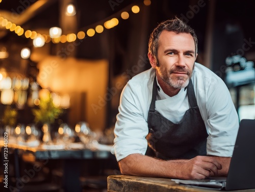 establishment. Small business owner focused on work at restaurant table with blurred background. pitch deck slides, case study pages, designed for brand storytelling and e-commerce strategy.