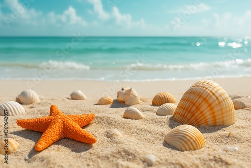 Estrella de mar y conchas marinas sobre arena dorada en la orilla de una playa tropical con aguas turquesas y cielo despejado