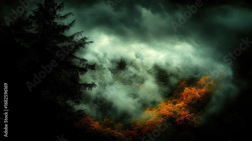 Ethereal Autumnal Forest Landscape with Mystical Fog and Dramatic Sky View