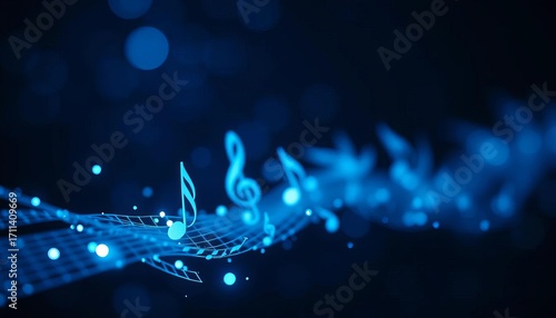 Ethereal blue musical notes, softly glowing against a dark, bokeh-filled backdrop, stock, blue