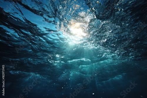 Ethereal Blue Ocean Depths with Sun Ray Background