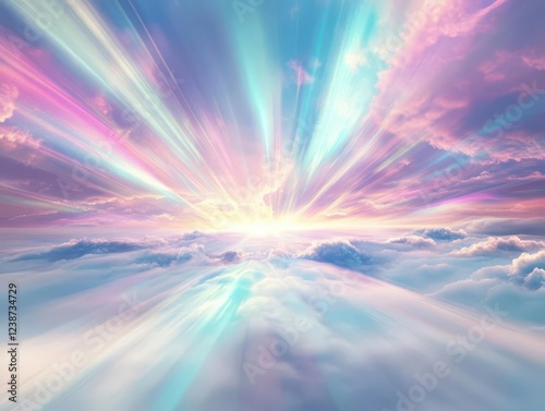 ethereal cosmic landscape with luminous aurora-like formations, spiritual light beams piercing through mystical clouds in pastel colors