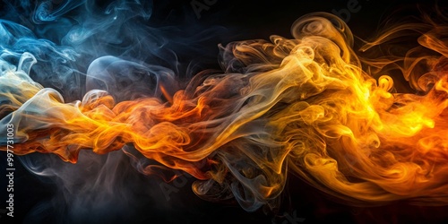 Ethereal Dance of Blue-Grey and Orange-Yellow Smoke Abstract Swirling Art on Black Background - Mystical Elegance for Home Decor, Graphic Design, and Artistic Expression