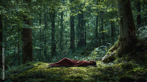 Ethereal Female Figure Resting on Forest Floor Under Red Blanket: Exploring Tranquility and Natural Serenity
