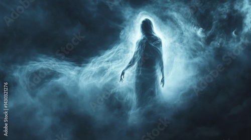 Ethereal Figure Emerging from Mystical Blue Haze: A Dreamlike, Atmospheric Artwork