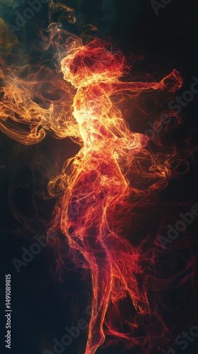 Ethereal figure formed of vibrant swirling flame and glowing embers against darkness