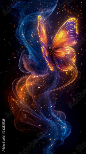 Ethereal Flight: Bioluminescent Butterfly Ascending Through Cosmic Currents