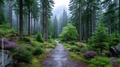 Ethereal Forest Path with Mist and Vibrant Wildflowers Cinematic Landscape Featuring Towering Evergreen Trees and Lush Greenery in a Serene Atmospheric Setting