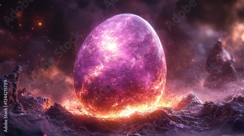 Ethereal glowing egg surrounded by fiery landscape and cosmic elements