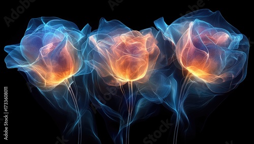 Ethereal glowing flowers, blue and orange, on black
