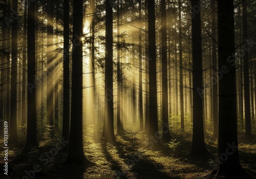 Ethereal Golden Sun Rays Piercing a Misty Forest, Creating a Majestic and Tranquil Woodland Scene with Towering Trees at Dawn