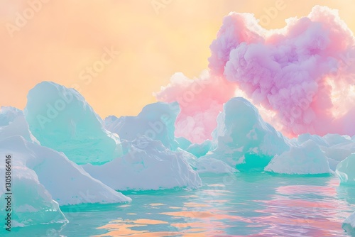 Ethereal icebergs reflect pastel colors under soft sunset sky at tranquil waters