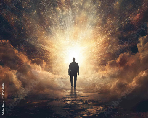 Ethereal Illustration of a Silhouette Walking into a Radiant Light in a Mystical Cloudscape for Spiritual and Inspirational Themes