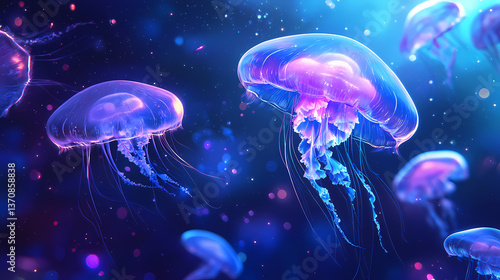 Ethereal jellyfish drift in a glowing, underwater nebula. perfect for fantasy, dreamscape, or spiritual themes. Luminous Drift. Illustration