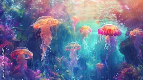 ethereal jellyfish floating in a vibrant tropical oasis enchanting aquatic scene digital painting