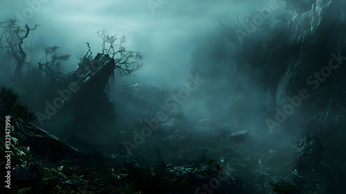 Ethereal landscape shrouded in mystic fog, silhouetted trees and rugged terrain creating mood