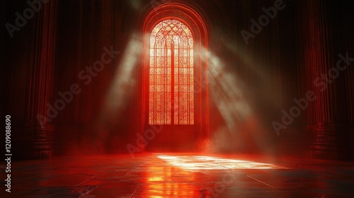 Ethereal Light Streaming Through an Ornate Gothic Window in a Dark, Enigmatic Hallway Evoking Mystery and Intrigue in a Mesmerizing Setting