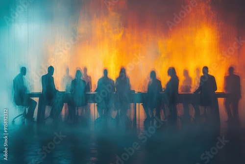 ethereal longexposure capture of business meeting in progress blurred figures around conference table emanate ghostly auras conveying passage of time and dynamic energy of collaboration