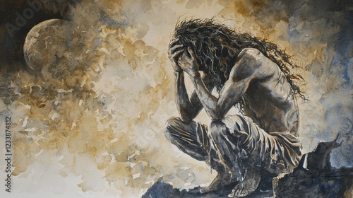 Ethereal moment captured in watercolor depicting man in despair