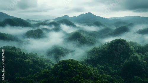 Ethereal mountain landscape with rolling hills shrouded in morning mist, featuring layered mountains and sunlight breaking through dense forest canopy.