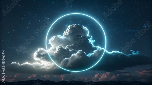 Ethereal Neon Circle Encircling Dreamy Cumulus Clouds Under a Starry Night Sky