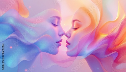 Ethereal portrait of two young caucasian females with vibrant, dreamlike color swirls