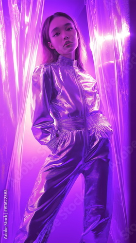 Ethereal portrait of woman in shimmering outfit surrounded by translucent curtains for Y3K aesthetic fashion editorials, futuristic textile showcases and next-generation virtual reality experiences