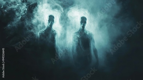 Ethereal silhouettes emerge from swirling mist, creating an enigmatic and haunting atmosphere that captivates the imagination.
