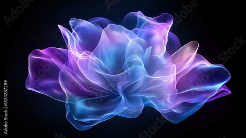Ethereal smoke art in vibrant blue and purple hues swirling against black background creates abstract floral shape with translucent flowing layers.
