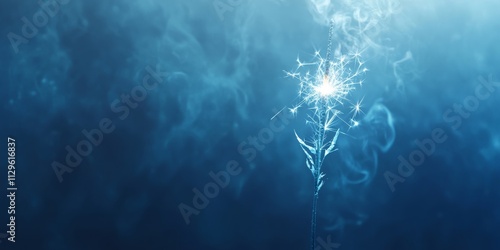 Ethereal sparkler glowing amidst soft smoke and deep blue gradients, radiating elegance