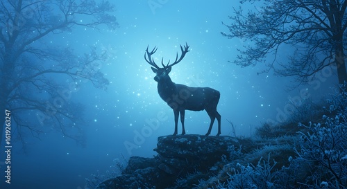 Ethereal Stag Beneath Mystic Sky, Spirit of the Forest Awakens, Twilight Watcher on Rocky Outcrop, Frost-Kissed Enchanted Silence, Legend of the Majestic Guardian.