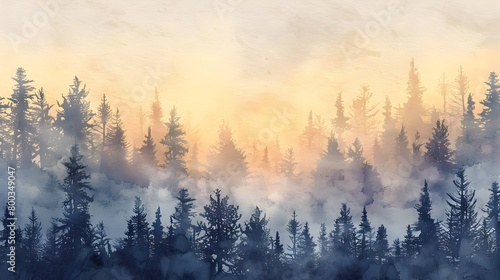 Ethereal Watercolor Landscape of Forest Silhouette at Misty Sunrise