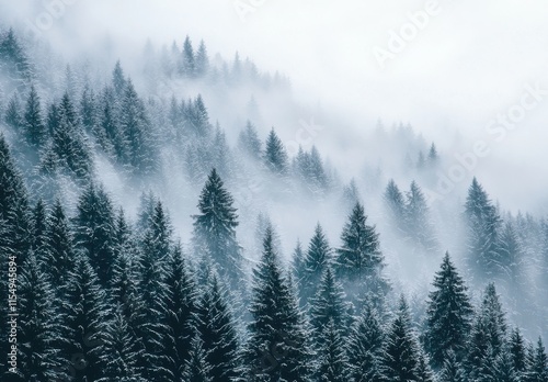 Ethereal Winter Landscape with Dense Pine Forest and Soft Fog Hanging Over the Evergreen Trees in a Serene and Calm Environment