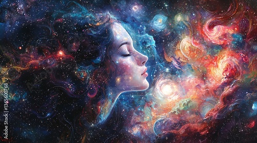 Ethereal Woman in Cosmic Universe with Colorful Nebula and Stars