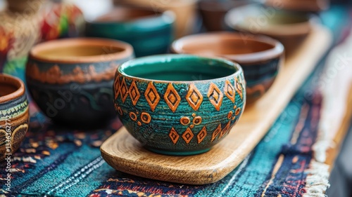 Ethical products and local and materials concept. A vibrant collection of handcrafted ceramic bowls, showcasing intricate designs, resting on a wooden tray atop a colorful textile.