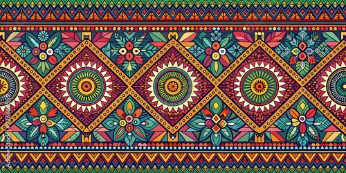 Ethnic and tribal inspired seamless ornament with colored shapes and lines on background. Bohemian style print, Bohemian