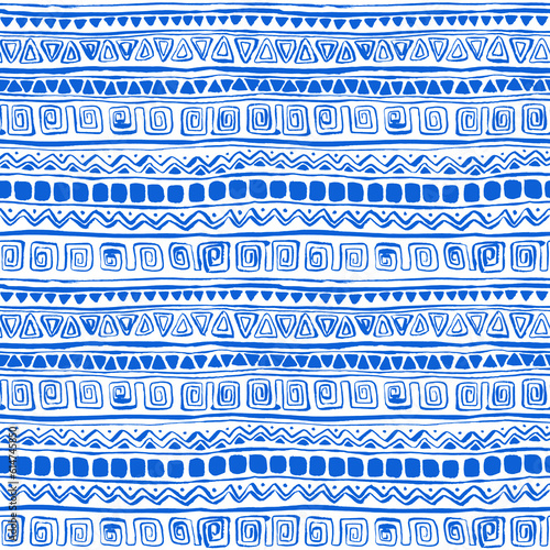 Ethnic blue and white seamless pattern. Gouache hand drawn boho repeat print. African monochrome ornament for textile, fabric, wallpaper, wrapping paper, decoration.