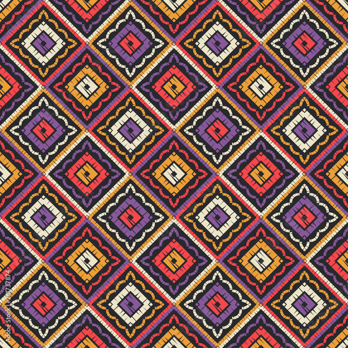 Ethnic boho seamless pattern. Lace. Embroidery on fabric. Patchwork texture. Weaving. Traditional ornament. Tribal pattern. Folk motif. Can be used for wallpaper, textile, wrapping, web.