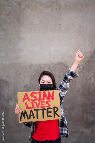 Ethnic female in mask and with carton placard with inscription Asian Lives Matter protesting with raised arm in city street and looking at camera