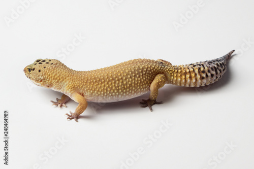 Eublepharis. Yellow gray gecko, close-up on a white background.