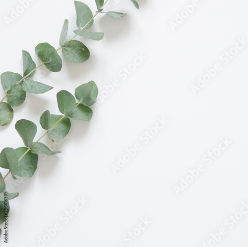 Eucalyptus leaves on white background. Flat lay, top view, copy space