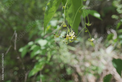 日本:ツリバナ(Euonymus oxyphyllus var. oxyphyllus)/ぶら下がって咲く小さなクリーム色の花と蕾/長野・5月