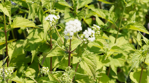 Eupatoire ou Eupatorium rugosum braunlaub, plante à floraison vaporeuse en corymbes de fleurs blanches pur sur tiges dressées rougeâtre garnies d'un feuillage buissonnant vert
