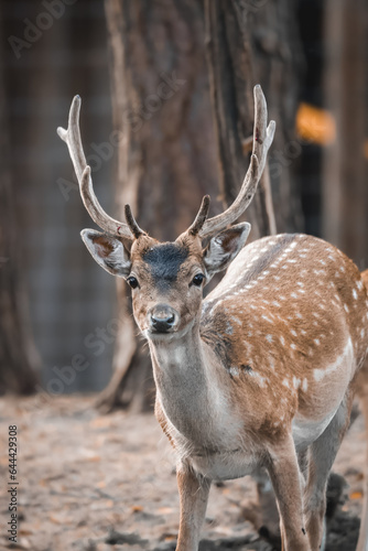 Eurasian male deer stand on their feet and look into a camera in the forest on a sunny summer day.