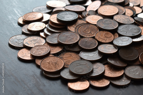 Euro cent coins on wood table.