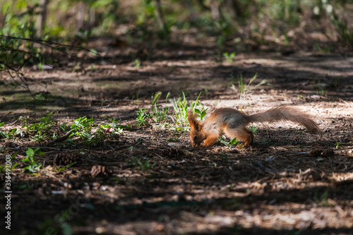 Euroasian red squirrel on the ground looking for nuts to eat in woodland park outdoors