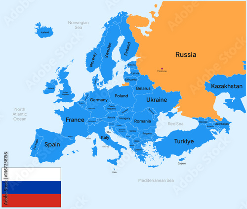 Europe Map Highlighted at Russia Country with Flag and capital city