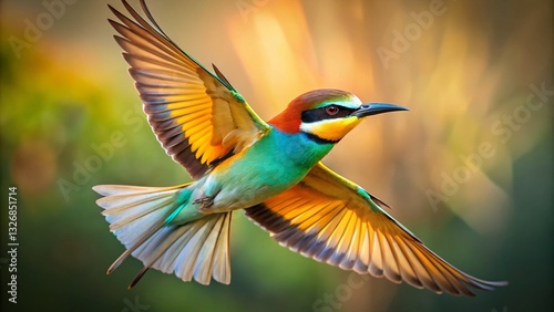European Bee-eater Bird in Flight, Isolated White Background, Low Light Photography