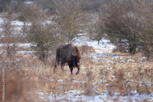 European bison in snowy nature. Bison in the bushes area. European wildlife.