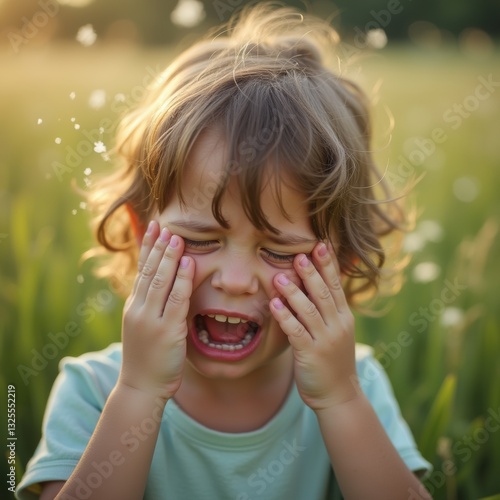 European child’s puffy red eyes, grassy field blurred, pollen hints at allergy-induced puffiness.